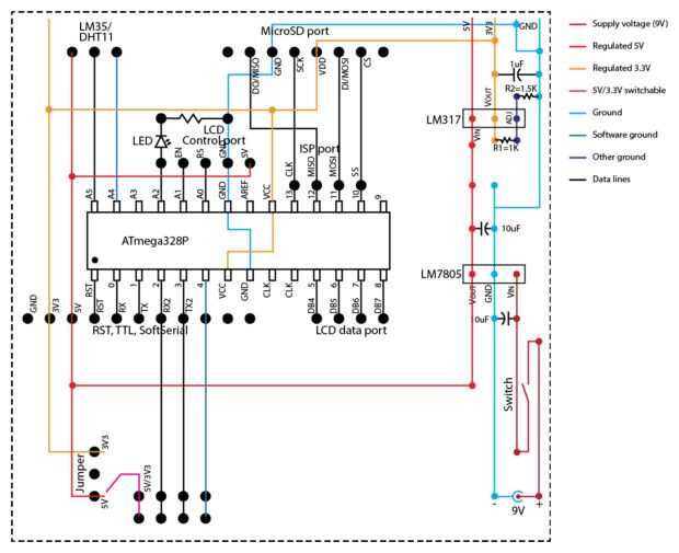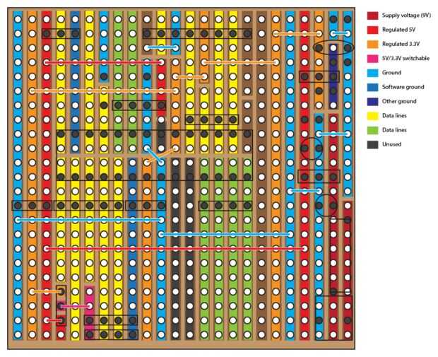 Aquí va el diseño de conexiones en el tablero de la tira. Para su comodidad he color-coded de los cables y tiras y definidas en la leyenda. También es una tira esquemas amigables, otra vez en diferentes colores. No te dejes obtener intimidados ante la aparente torpeza o la complejidad del diseño, por favor, tenga conmigo -: voy a dividir en segmentos funcionales en secciones posteriores.