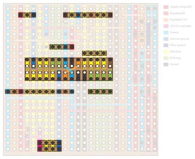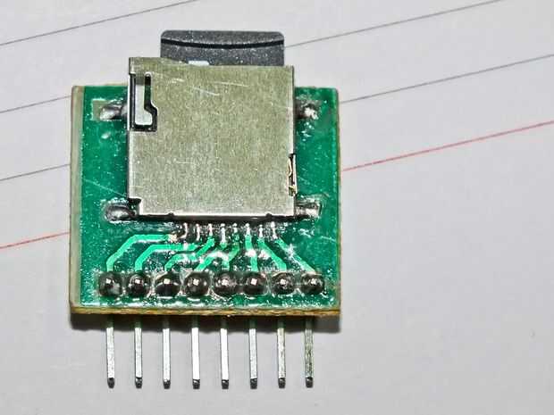 3. en la parte superior derecha es un encabezado de 8 pines para conectar un tablero de arranque MicroSD. Esta placa breakout no tiene ningún circuito adicional, sólo expuso los 8 pines de la tarjeta MicroSD a través de 8 pernos amable breadboard (ver fotografía). ATmega es alimentado a 3, 3V, tarjeta SD tendrá sólo esto mucho voltaje en cualquier momento, y supongo, no necesito un desplazador de nivel de lógica.