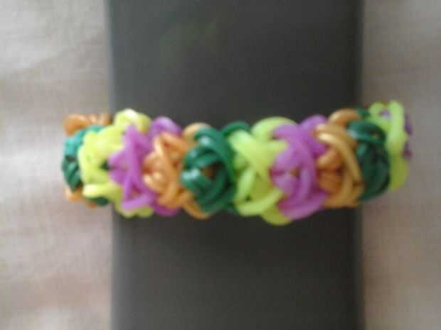 Esta pulsera de telar de la Cruz doble es bastante fácil. Si eres capaz de hacer una espina de pescado, probablemente puede hacer esta cruz telar pulsera sin problema. Lo hice con dos bandas de goma de color, morados y blanco, decorada con algunas fl