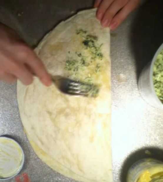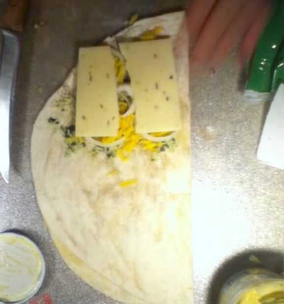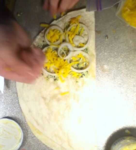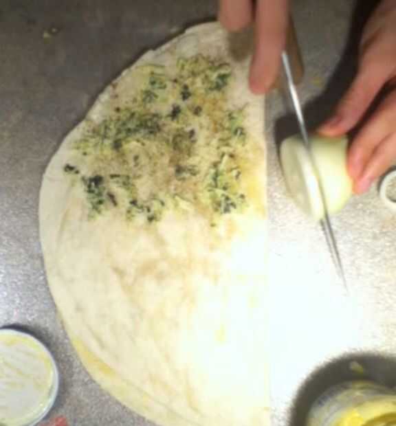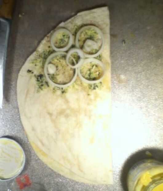 Doble plano medio de la tortilla en una media luna. En un lado de que difunda la alcachofa queso parmesano (variar fino), que colocar aros de cebolla en rodajas finas sobre el chapaleteo mutuamente como un diagrama de Venn.