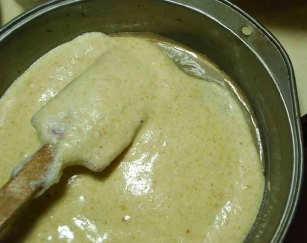 Tomar un molde que preparaste y difundir un séptimo de la masa * en la parte inferior tan uniformemente como sea posible.  Deje que la mezcla toque los lados de la Panamericana en varios puntos.  Coloque en el horno precalentado.  Hornear de 10 a 12 minutos o hasta que el pastel se endurece y empieza a adquirir color.  Retirar de la sartén con una espátula, invertir y rápidamente pero con cuidado corte el papel.  Enfriar sobre una rejilla.  Continúe de esta manera hasta que todas las capas se cuecen al horno.  Durante el tiempo de cocción, preparar el relleno de la siguiente manera: