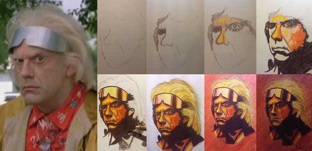 Pintura acuarela de Doc Brown en regreso al futuro.En la película Doc muestra Marty, utilizando un modelo, cómo obtener un rayo para atacar el DeLorean y lo envían de regreso al futuro. El coche modelo pequeño entonces coge el fuego og respons Doc ha