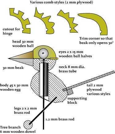 Hacer 12 aves. Tenga cuidado de perforación huevos, utilizar agujeros para evitar que la broca resbale. Utilizar un pegamento fuerte para fijar las bisagras, pero asegúrese de que todavía se mueven fácilmente. La barra de cobre amarillo de 1.2m m se utiliza para empujar el pico abierto hasta que llegue a 45°(ish) y es refrenada por el peine cuando toda la cabeza se moverá hacia arriba, exponiendo el cuello de latón.