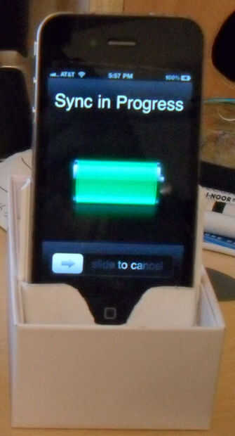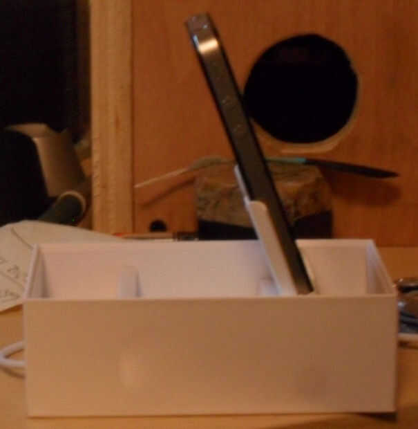 En primer lugar, el teléfono se encuentra en la bandeja de plástico es plástico muy grueso y parecía que la mitad era tan profundo como el iPhone, así que si cortar por la mitad y pegados juntos, el teléfono se deslizaría hacia adentro y hacia afuera. Pensé que podría subir con alguna forma de sujetar el conector en la parte inferior de la bolsa, y yo pude Deslice todo en ranuras en la parte inferior la mitad de la caja.