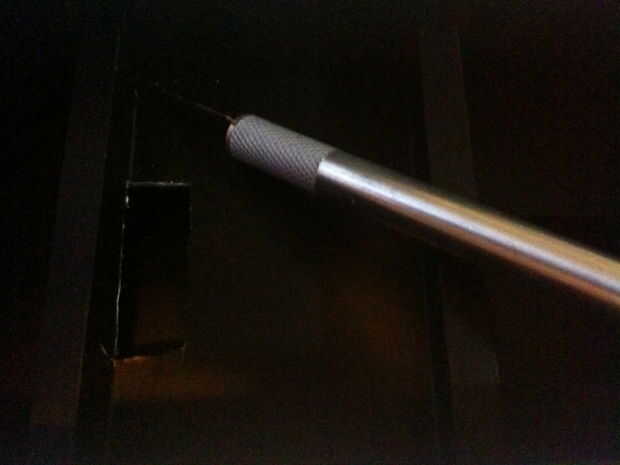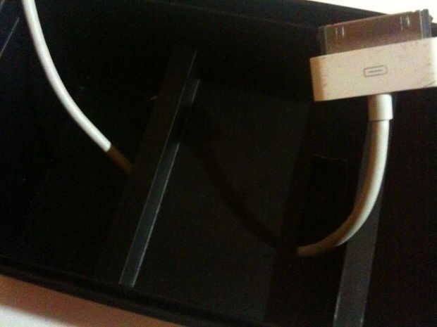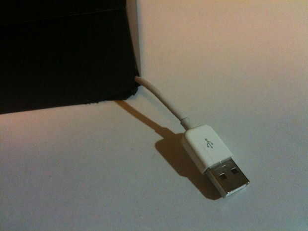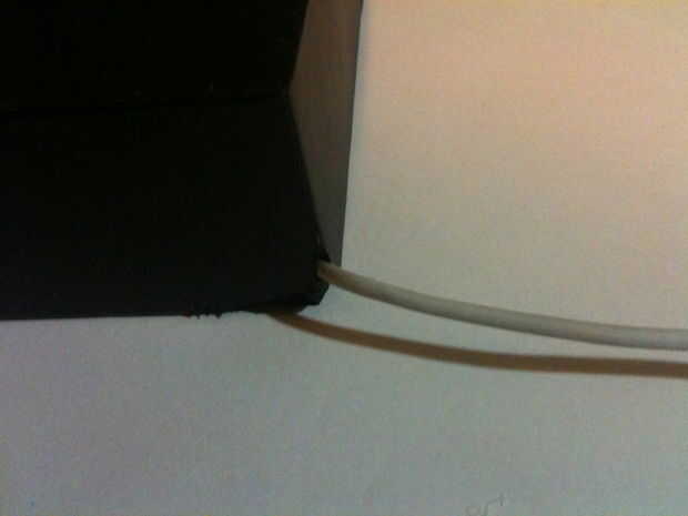 La primera parte de este paso es conseguir el cable de carga en posición. Para ello, establezca el caso en la caja en la posición deseada. Un pedazo de espuma densa puede utilizarse para aumentar el ángulo en el cual se sentará el caso. Una vez que el caso está en su lugar, utilice un lápiz o pluma para trazar en el conector del cargador va (el agujero rectangular en la parte inferior de la caja). Luego, con el cuchillo del exacto, corte el orificio rectangular en el material de la caja. A continuación, introduzca el cable a través de este agujero y a través del compartimiento posterior (como visto en fotos). Para ello algunos de los la estructura rígida de cartón espuma tendrá que quitarse, pero trate de mantener tanto como sea posible en el tacto.