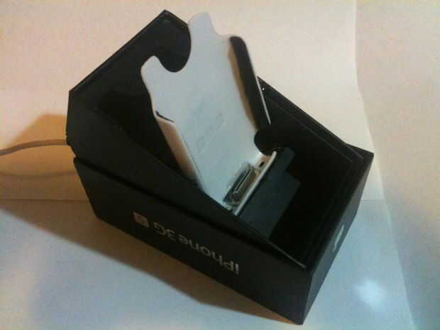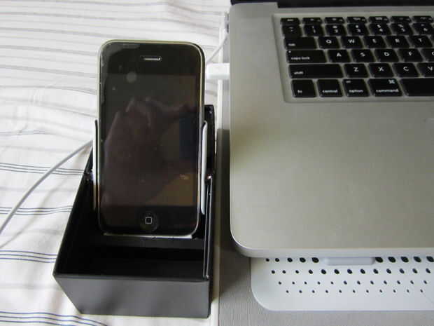 Se puede establecer la base dentro de la parte superior de la mitad de la caja del iPhone para poner todo en un ángulo más escarpado.
