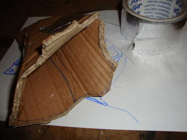 Ahora, hacer un dibujo aproximado de las dos placas que se pliega en cuatro lados para hacer el pico. Usar mis imágenes para referencia. Recortar en la cartulina. Sostener con las manos y ponerlo sobre la boca. Ahora tiran de la pared. Había hecho incorrecto. Vuelve a intentarlo. La verdadera historia de allí. Utilice algunas cintas de banda para asegurar las piezas juntos.