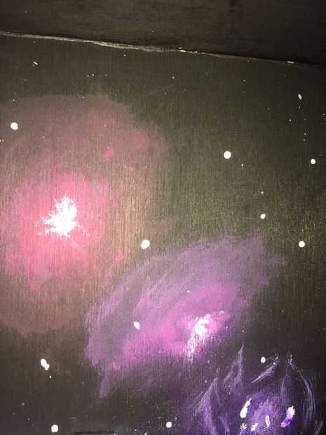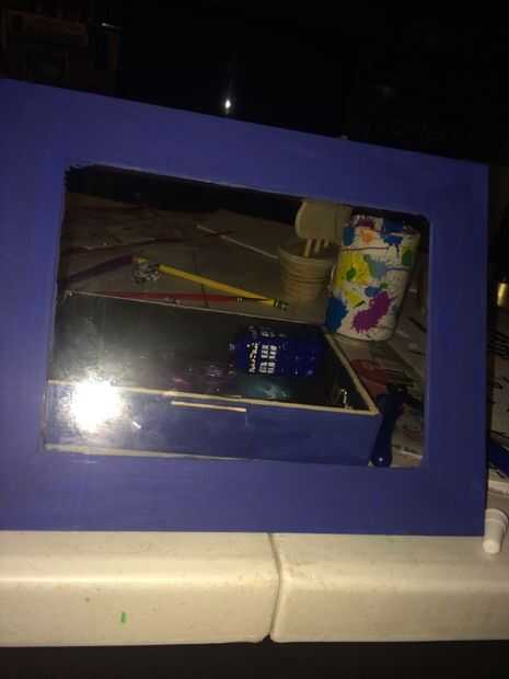 empecé con una simple caja de sombra, puedes hacer el tuyo o comprar uno, compré mina, me decidí por el interior quería ser una galaxia así que primero pintar el fondo negro y luego hacer color de galaxia en el fondo haciendo que los tonos van de un color más claro en el centro y más oscuro alrededor de él, después que acabo de poner estrellas alrededor de las blancas de pintura puntos por todas partes , para el exterior de la caja pintó un tardis azul