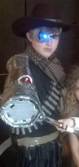 Las cosas que necesitas para hacer este traje es unas láminas de cartón, un cinturón de balas de nerf, si tienes una nerf vulcan, viene con una, una manga larga negro camiseta y pantalón negro una linterna, una roja y una azul led, una bufanda y un sombrero de vaquero, un cinturón y opcionalmente un poco de cuero.