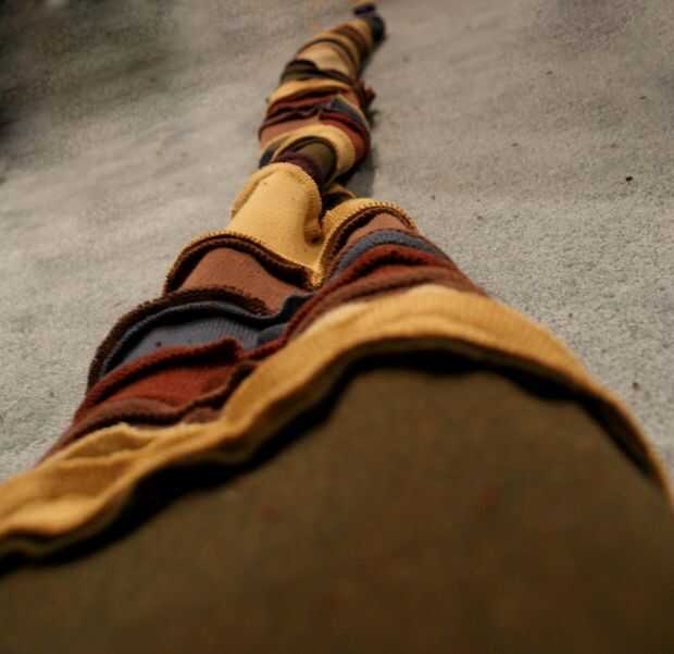 Hacer dos longitudes iguales de la bufanda puede ser cosidos y luego la vuelta derecha-lado-hacia fuera. Todo se hace dos veces. Yo recomendaría que usted * no * corte las bandas antes de tiempo, pero en su lugar hacerlo medida que avanza.