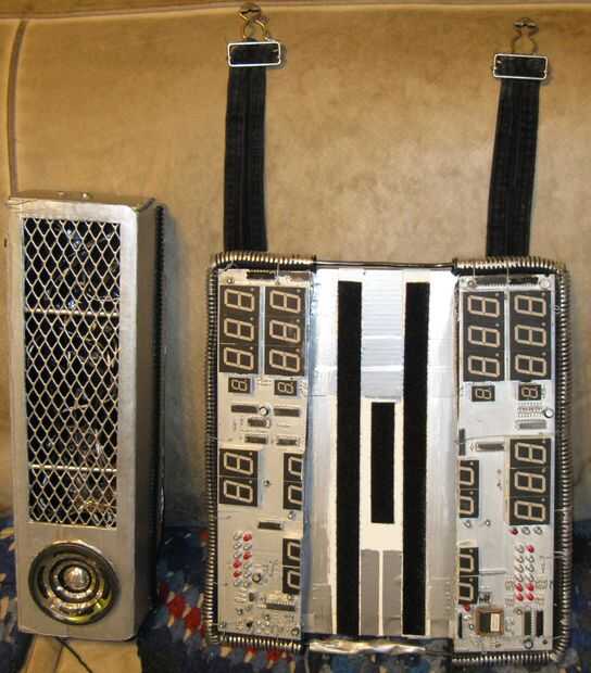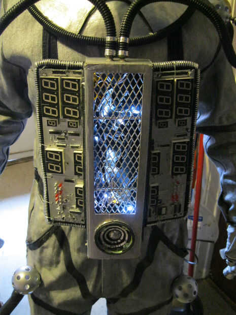 Tomé la parte de los conectores en forma de botón y les había cosido en las costuras a lo largo de la clavícula de mi traje de Cyberman, así que puedo colgar la consola de mis hombros como un par de guardapolvos de fijación. Algunos velcro tiras en la parte posterior de la consola y cosido al frente de la demanda, ayuda a estabilizar la pieza del pecho mientras estoy en movimiento.