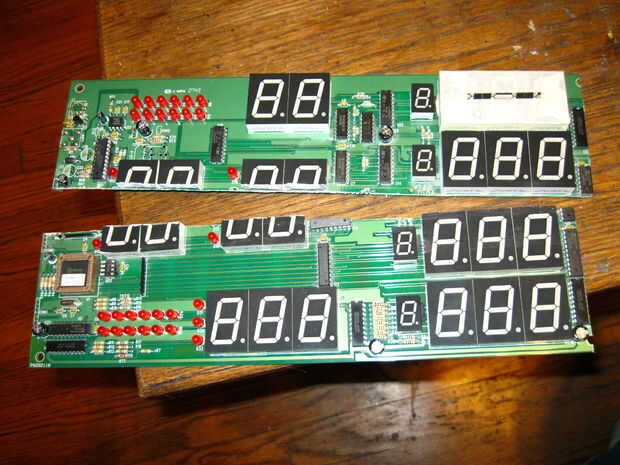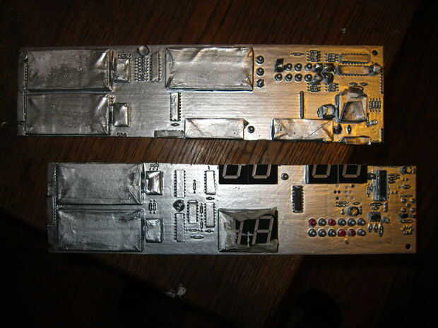 Todo se fue montado en una especie muy hack slash-bricolaje de moda. Había grabado juntos un par de placas de soporte de tamaño revista en tamaño adecuado y cortar dos piezas de espuma (extremadamente) varios para el mismo tamaño que las placas de circuitos. Una vez que los circuitos fueron arreglados en los consejos de la revista con la espuma intercalada entre, perforé a través de la pila entera en varios lugares, corriendo longitudes del alambre por los agujeros y girar hasta seguro. El arreglo entero está bordeado por el tubo de plástico negro mismo, mantiene en su lugar con el mismo método de alambre.