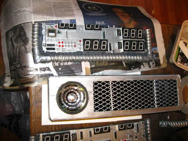 La consola central de un Cyberman real tiene una pantalla en la parte superior y una cosa redonda en la parte inferior. El pedacito redondo parece tipo de la vivienda para un ventilador, pero ya que había roto recientemente abrir un CD portátil reproductor ya no funcionaba, me encomendó a uno de los oradores y que. Me trazó un círculo en la parte inferior de la caja y recorta un espacio lo suficientemente grande para acomodar al altavoz. Por encima de eso, tallado hacia fuera un área rectangular. Luego pinté la plata toda la cosa.