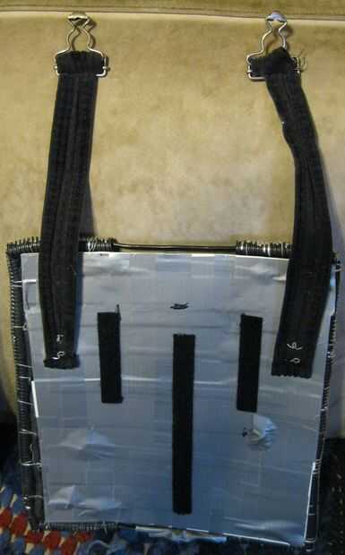 Pensé en algunas maneras para realmente usar esta consola, pero el método de "monos" parecía ser el más fácil. Realmente tuve un viejo par de guardapolvos que podría sacrificar a este propósito, pero si no, es bastante fácil de encontrar el hardware en cualquier tienda de tela. Lo que hice fue cortar las correas de los monos, y pegamento (y luego alambre de montaje) los extremos a la parte posterior de la consola.