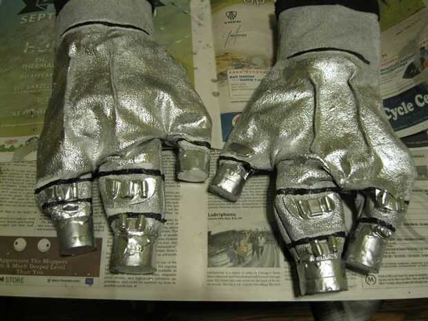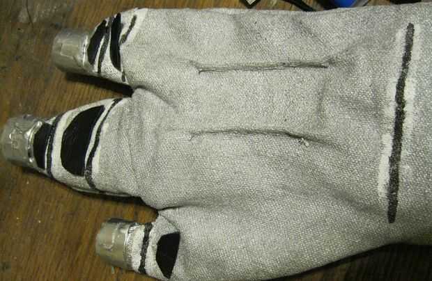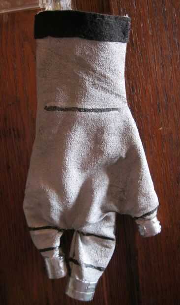 El pequeño "tazas" en la punta de los dedos son de tiras de placas de soporte de cómic, con cinta de conducto juntos y luego se ajustaron a los extremos de los dedos. Cosió dos costuras en el dorso de cada mano, sólo para la decoración realmente, luego había pintado todo de plata.
