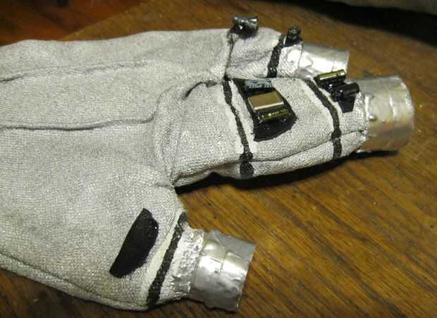 Editar: cortar las aberturas en los guantes de la muñeca a la base de la palma y elástico añadido shunts que ahora son mucho más fáciles de sacar y apagar. Además, puse algunas decoraciones en los dedos, añadiendo parches de cuero y pegado en algunos pedacitos de tecnología desde el lector de CD roto mencionado anteriormente. Luego pintado plata sobre cada nueva sección y volver a pintar las líneas del segmento negro. Así que ahora se ven más "cyber".