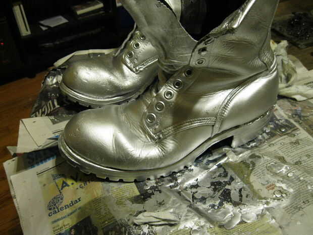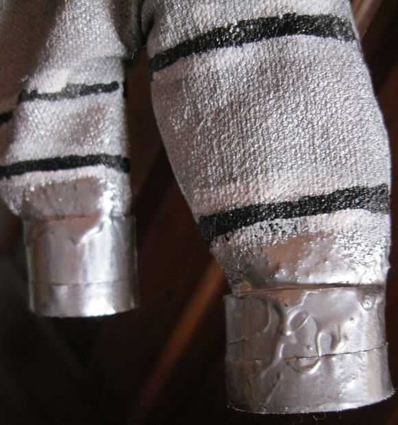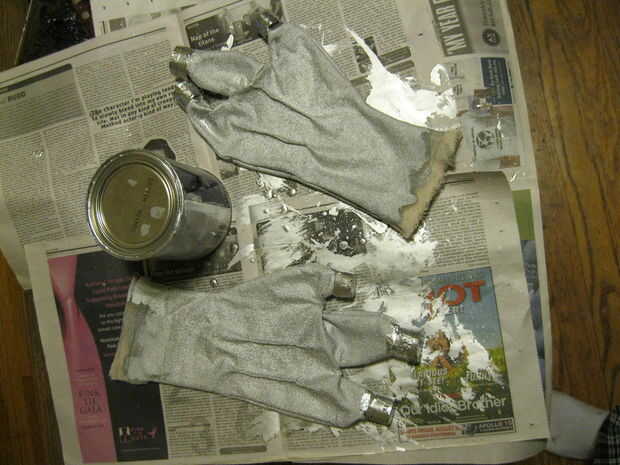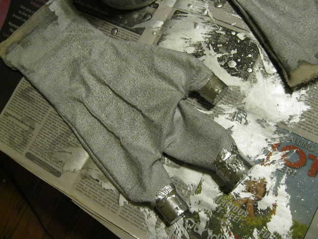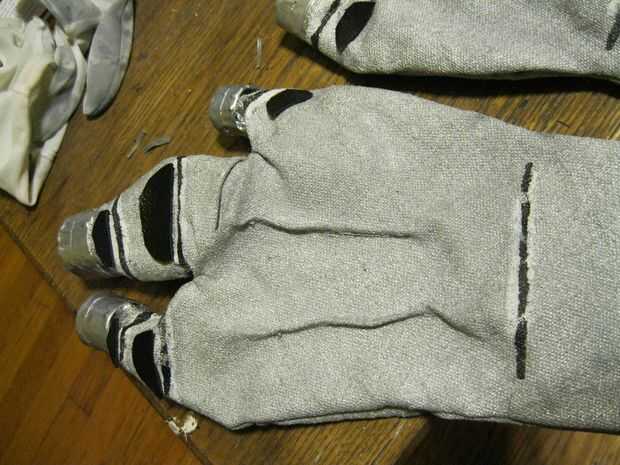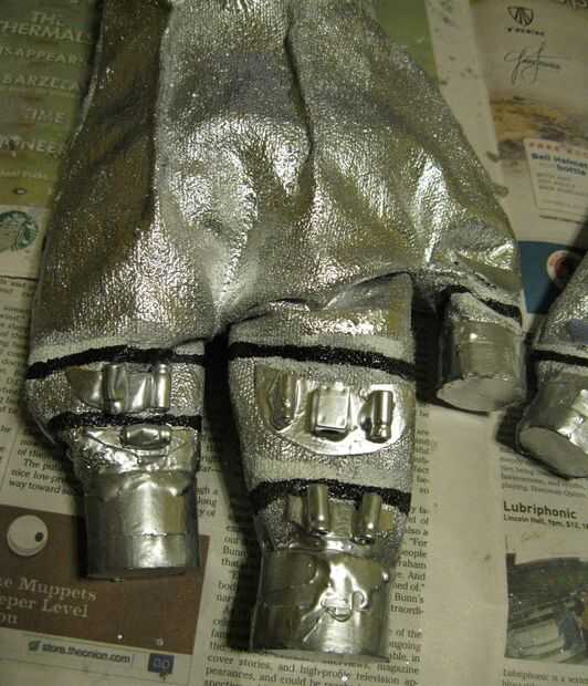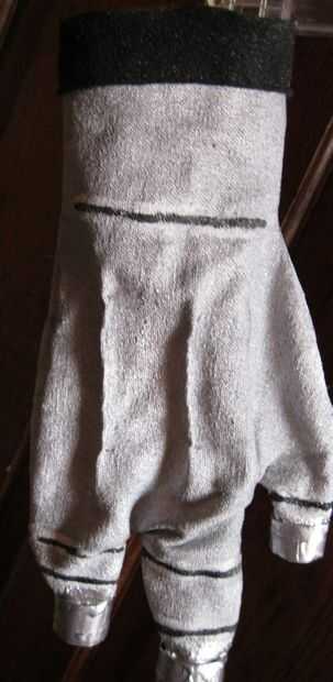 Añadido algunas líneas negras para sugerir segmentos articulados y rocía con el mismo acabado acrílico que usé en el traje, para estar en el lado seguro. El problema de los guantes es que las muñecas son muy apretadas así que son muy difíciles de conseguir. Supongo les pude rehacer, realmente tengo tiempo, pero probablemente no lo haré. Sinceramente, estaría bien con un par de guantes de plata hechas de antemano, o cualquier otros guantes te gusta que podrían ser pintado plata. Sólo tengo que tratar de hacer cosas desde cero. Estoy seguro que si supiera cómo adoquín, habría hecho mi propia plata botas demasiado.