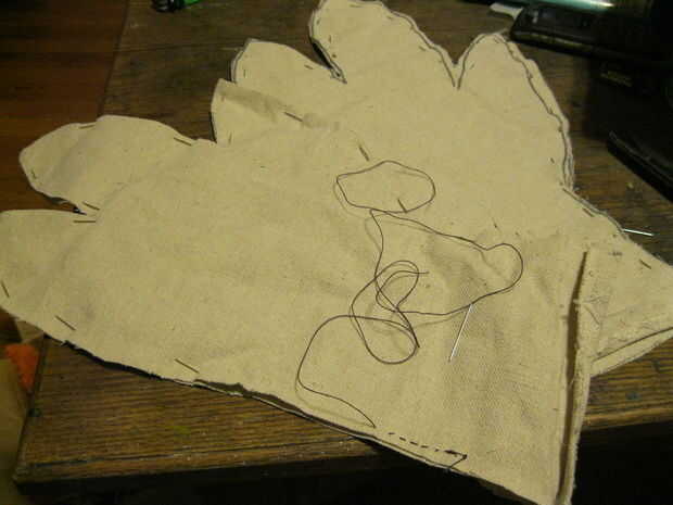 Básicamente, he extendido mi mano en una configuración de tres dedos y trazó una amplia franja alrededor de él en un viejo pedazo de tela. Recortarlo lo trazó tres veces más y cosieron a mano para hacer un par de guantes antibarro. Reforzado las costuras con causa de superglue que no quería correr ningún riesgo.