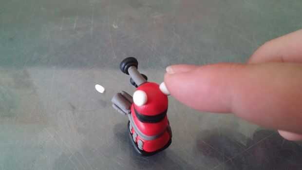Extienda una pequeña serpiente de blanco. Luego corta dos pequeños pedazos. hacen en los conos y luego presionan en la cabeza.