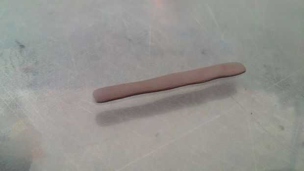 Usar el resto de la serpiente gris rodado hacia fuera y aplanarla. Colocar alambre en el centro y doble encima. Luego extraer una pequeña cantidad de arcilla de cada lado del alambre. Para el brazo batidor de huevo sólo tomar la arcilla de un lado del alambre y luego 4 serpientes pequeñas alrededor del alambre medio del brazo.