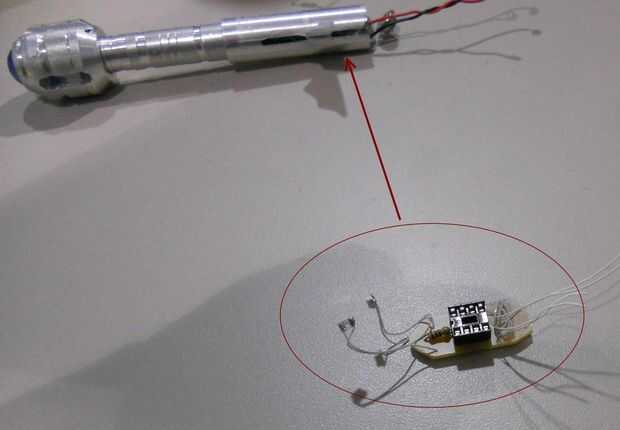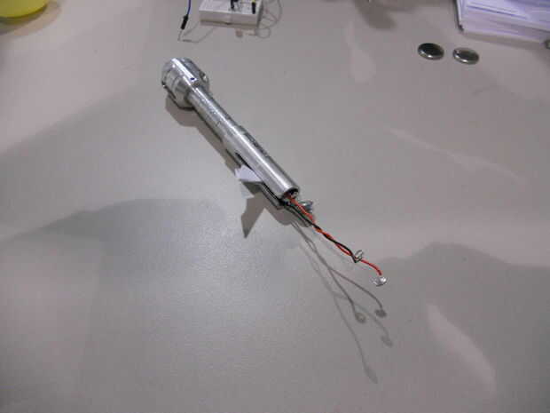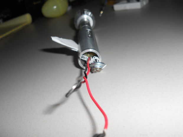 No pude averiguar cómo hacer un soporte de la batería en un espacio tan reducido. Mi solución fue encogimiento abrigo cuatro baterías juntos y conectar los cables al final. Los alambres se sujetan con cinta eléctrica firmemente envuelta.