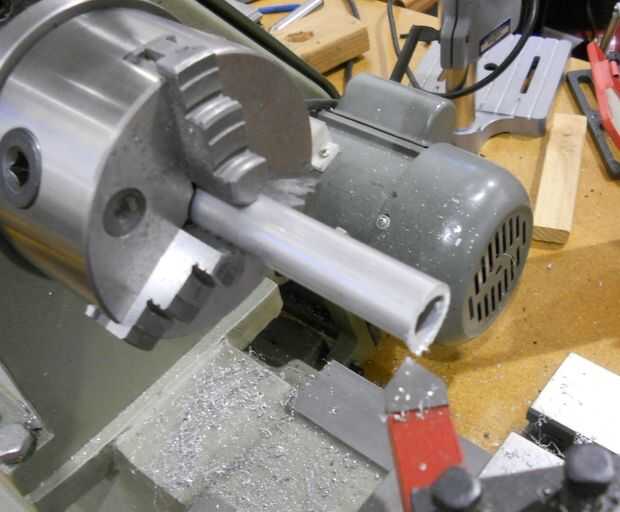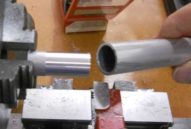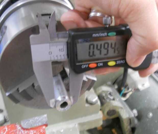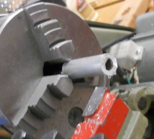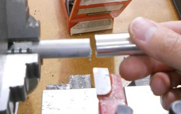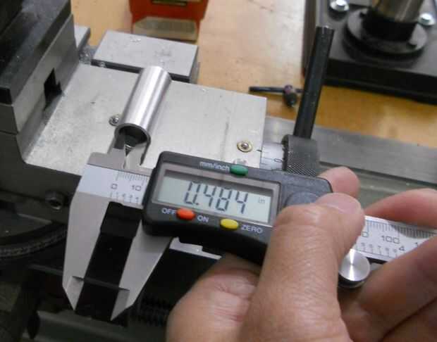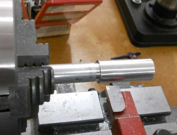 La siguiente pieza que se convirtió en el torno es la manga interna. El diámetro exterior se reduce por lo que resbala fácilmente dentro del cuerpo principal. Algo para recordar cuando giro metal es que la cantidad se duplica. Esto es porque estoy tomando material de ambos lados a medida que gira el material. Así que si elimino.25 pulgadas de material de reducir el diámetro.50 pulgadas. Hace una gran diferencia si se me olvida ese hecho. Y por desgracia es mucho más fácil de quitar material de lo que es para agregar en.