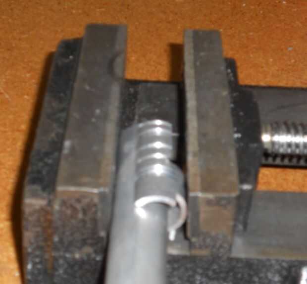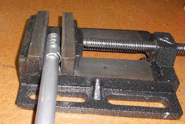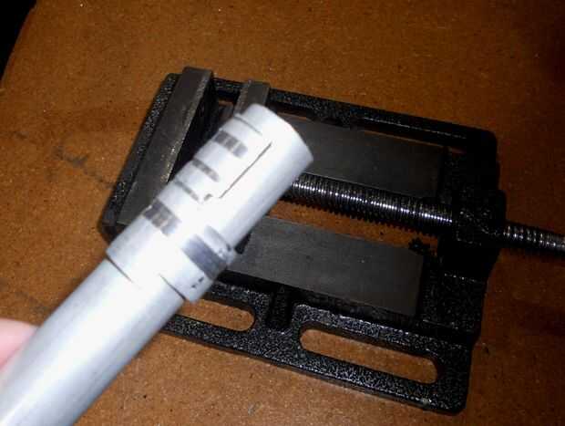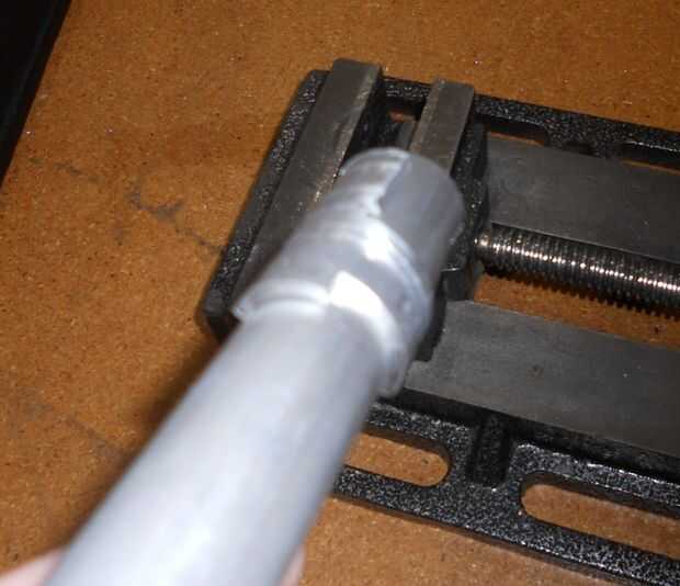 Ahora toma esa sección T y pulse en la sección de. 75" tubo usando un tornillo de banco. Esto moldeará el interior diámetro del T a. 75".
