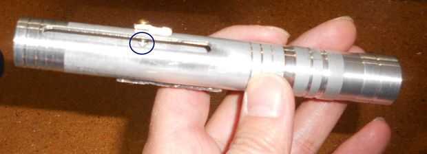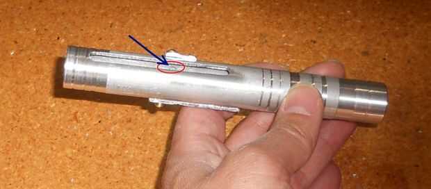 Vuelva a colocar la funda interna en el cuerpo principal y fije el interruptor otra vez. Haz un rotulador (marcador permanente) y en el orificio del cojinete. Deslice el interruptor hasta la parte superior de la ranura y hasta el fondo. Asegúrese de que el marcador está marcando la manga interna. Quite el interruptor y retire la funda interior del cuerpo principal.