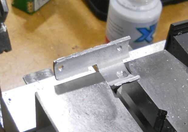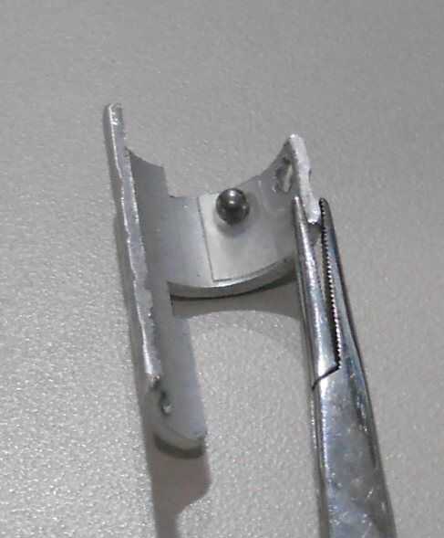 En el interior de la T hacer un bolsillo 1/16" de profundidad que se alinee con el orificio del cojinete en el cuerpo principal. Hacer el bolsillo dos veces tan grande como el agujero del rodamiento. Cortar un trozo de plástico dos veces tan grande como el bolsillo y super pegue sobre el bolsillo. Esto actuará como la «primavera» que pondrá presión a la baja en el rodamiento de bolitas. Poner grasa de eje o grasa de litio en el plástico.