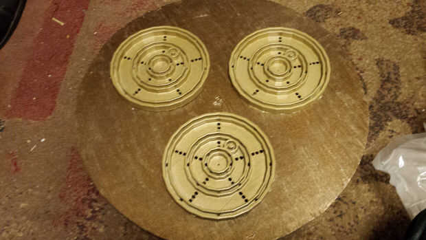 Lamentablemente he olvidado algunas de las fotos para este paso, pero el proceso es bastante sencillo. En consonancia con el estilo de diseño de Gallifreyan usaba un bronce metálico para el marco y el oro metálico de la marca, pero puede seleccionar cualquier color te gusta. Aplicar 2 capas a los diales y asegúrese de obtener dentro de los anillos. Para el marco, se aplican 2 capas, uno antes y uno después de que usted está cortando o ambos corte después. Mientras estoy escribiendo esto es invierno todavía, así que asegúrese de que deje la pintura seca a temperatura ambiente.