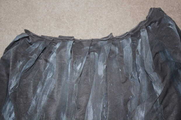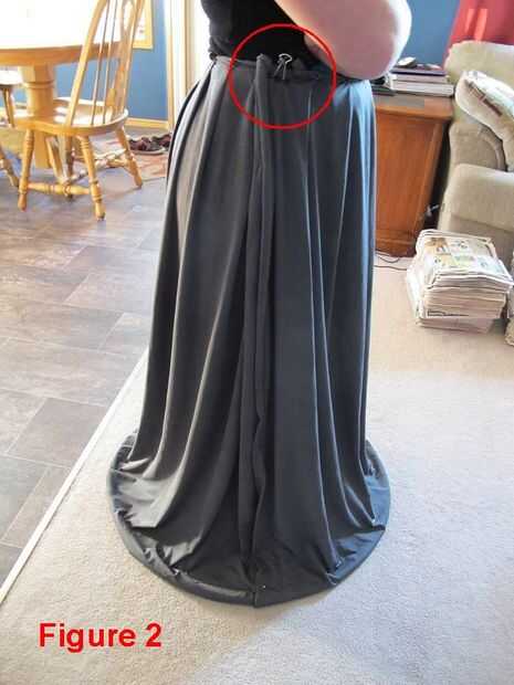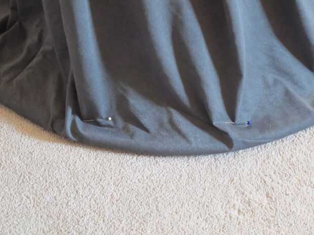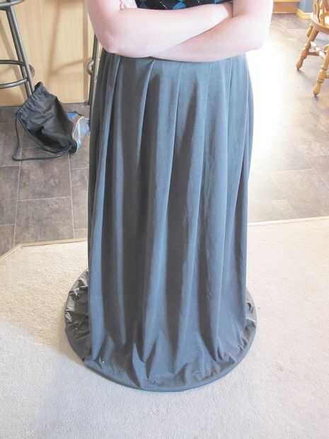 Coloque el aro en el suelo y empujar a la tela por debajo de ella. Tiene el vestido cubra la forma que desee sentarse y luego poner alfileres alrededor de la base cada pocas pulgadas para sostener todo junto. Una vez hecho esto toma la falda fuera y tendrá que hacer puntos de mano pequeñas en cada perno para sujetar a la tela en su lugar permanentemente. Una puntada en cada pin será suficiente para mantenerlo todo junto. Una vez que el vestido fue cosido vuelta adentro hacia fuera y corte la tela extra que no necesita.
