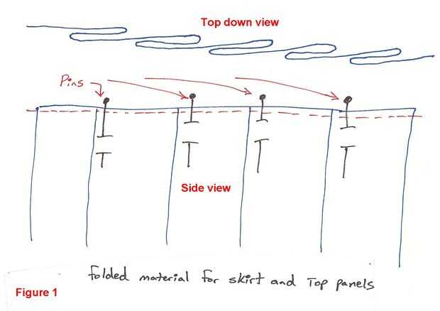 Coloque a la tela sobre el piso. Trabajarás con un lado del borde largo solamente. Empezar a doblar a la tela sobre en sí mismo, como se muestra en la figura 1. Ponga un alfiler a través en cada pliegue para sostenerla en lugar. Una vez que tengas la falda entera en un lado ahora puede coser la falda. Cosa según la línea roja punteada en la figura 1, quitando los pernos como coser. Si no tienes una máquina de coser yo recomendaría que usted golpeó un amigo a pedir prestado uno.