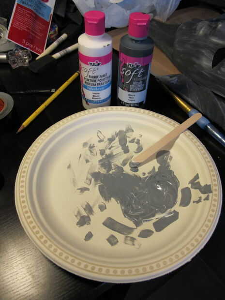 Para crear el efecto piedra en tela he utilizado pintura de tela.  No pude encontrar la sombra correcta de gris que quería así que mezclado blanco y negro hasta que me dieron un tono de gris claro, que me ha gustado mucho.