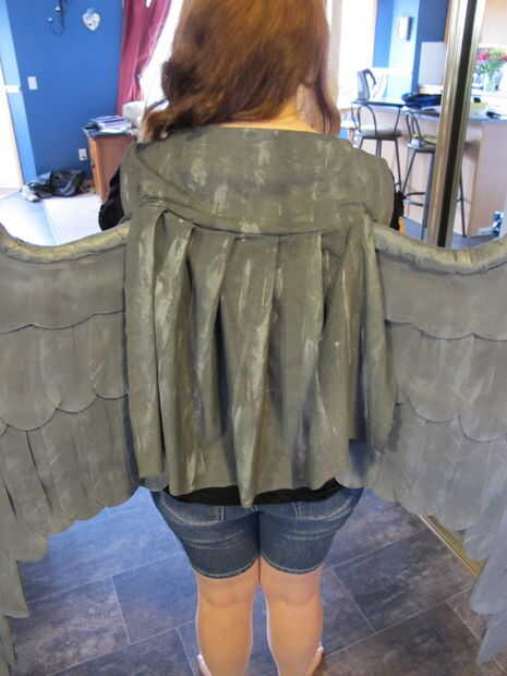 Rociar un vestido pintado y alas utilizando una piedra pintura textured. He utilizado guantes grises, medias,zapatos, se enfrentan a la pintura y pintura de pelo. Me puso el pelo en un moño antes de pintarlo y di sus falsos dientes puntiagudos.