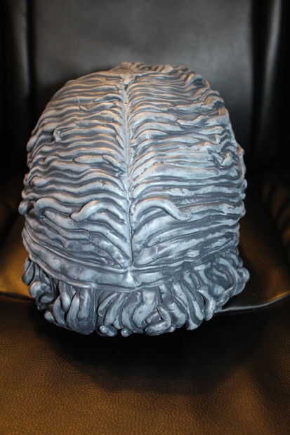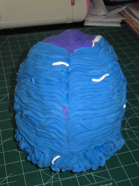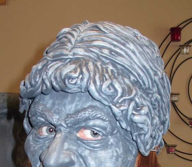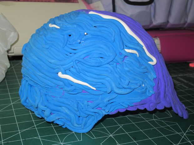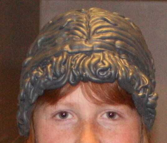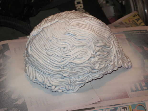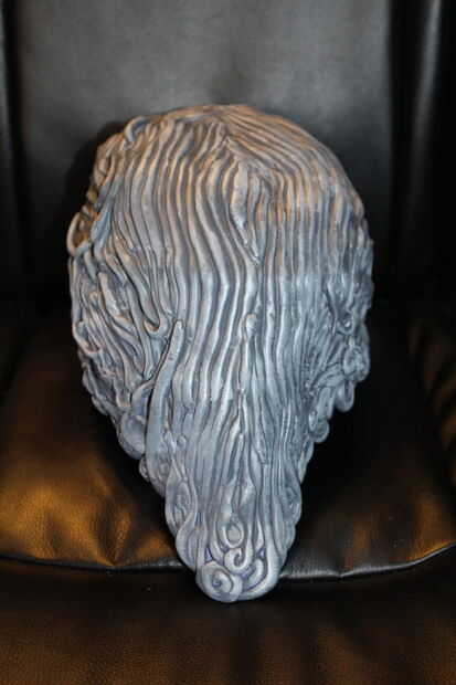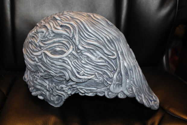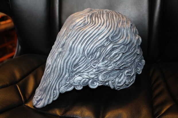 Ahora estás listo para pinta la cabeza de la pieza. Utilicé imprimación blanca 'Mata' a pintar las cosas todo. Se pega bien a la mayoría de las superficies y es fácil de pintar después. Tomó dos capas para obtener en todos los rincones y grietas del cabello. Luego pinté el cabello con pintura spray gris oscuro que tenía. Usted tendrá esta misma pintura más adelante en la construcción, así que asegúrese de usted un montón tener a la mano o puede conseguir más. Usted querrá encontrar un gris oscuro que se encuentra cerca de la tela que use para el disfraz.