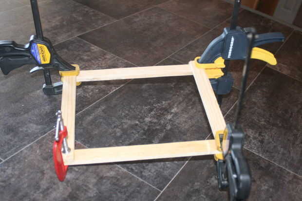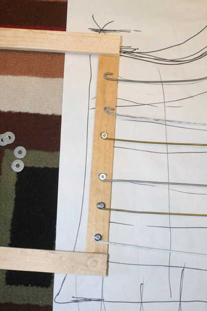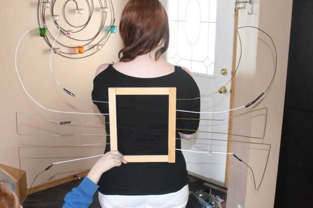 Las perchas no eran lo suficientemente largos para hacer cada lazo hacia fuera de la madera y de nuevo. Conecté los cables juntos por comprometidos los extremos de los cables por unos poquitos y luego utiliza cinta gorila para mantenerlos juntos.