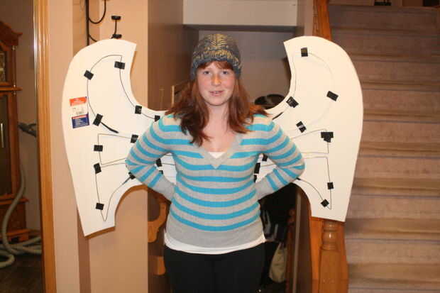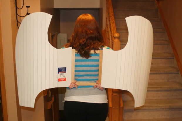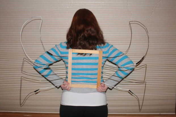 Ponga ahora usted ala sobre las perchas y utilice cinta para mantener temporalmente. Una vez que esté satisfecho con su ubicación, utilice una pistola de pegamento caliente para hacer la conexión permanente. No necesitará cubrir el alambre, sólo manchas aquí y allá.