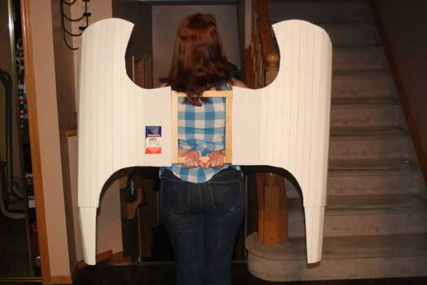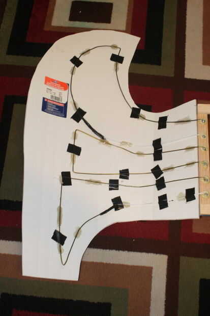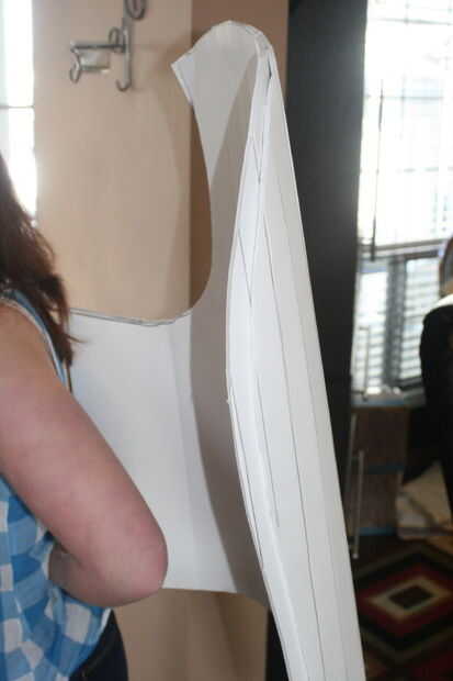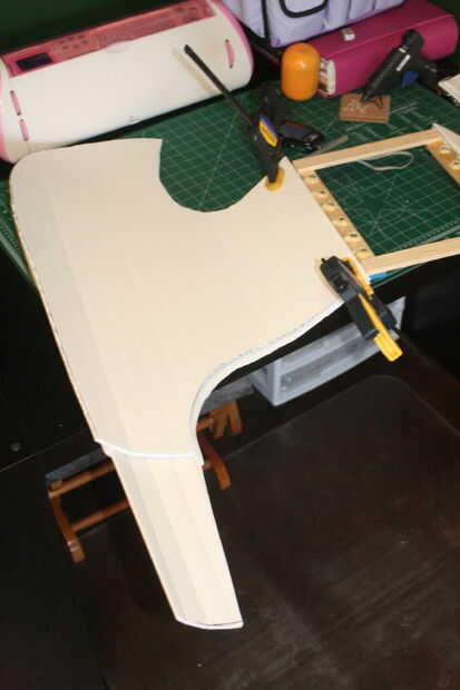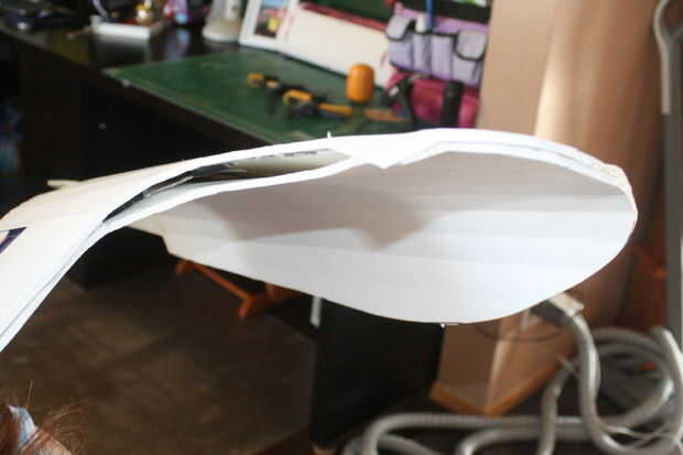 Antes de ir a colocar la parte delantera de las alas, usted necesitará hacer un poco ala extensión de la parte inferior de cada ala. Yo en un círculo la pieza que me refiero en la última foto. Haga cortes de alivio en esta pieza igual que las alas y luego dóblelo así sus curvas. Asegúrese de que la línea de las líneas de plegado con los del ala antes de pegarlos en el lugar. Otra vez había utilizado pegamento caliente y había sobrepuesta la extensión con el ala por sólo unas pocas pulgadas. Si usted no se alinean las líneas de plegado, se obtiene una mirada torcida. Otra vez se puede ver en mi última foto donde esto sucedió en el lado derecho. Me llevó loco así que terminé lo cortando y hacerlo de nuevo, esta vez recto.