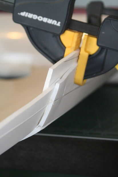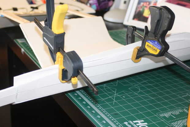 Como se puede ver en las fotos no alinean los extremos del ala. Esto es aceptable. Se todos se ocultará más tarde. Usé pinzas para sujetar las puntas de las alas mientras seca ya no quieren permanecer juntos debido a la curva. La otra razón para utilizar palmadas era que quería más curva al final de las alas. Las abrazaderas celebraron la curva que quería mientras seca el pegamento caliente.