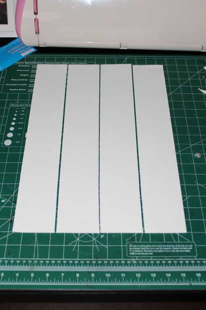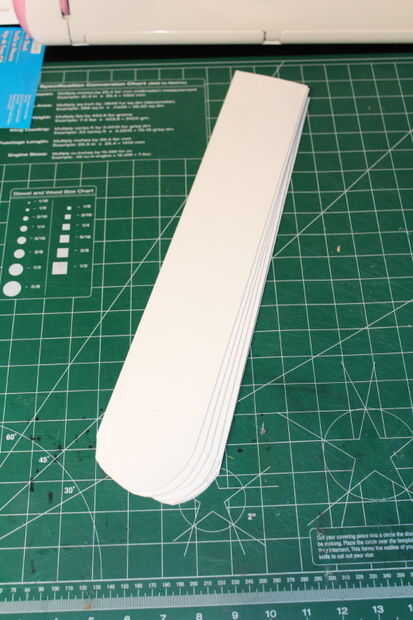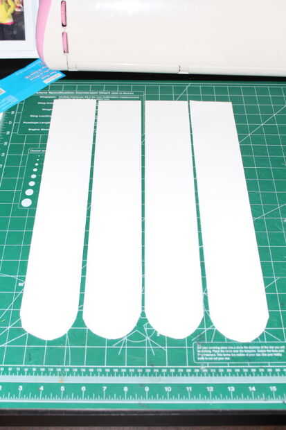 Cortar cada hoja en 4 rodajas iguales. En mi caso, cada pluma era 3 pulgadas de ancho y 18 pulgadas de largo. Fui con piezas grandes de espuma como quería las plumas largas para ser una sola pieza. Luego redondea los extremos de cada pluma.