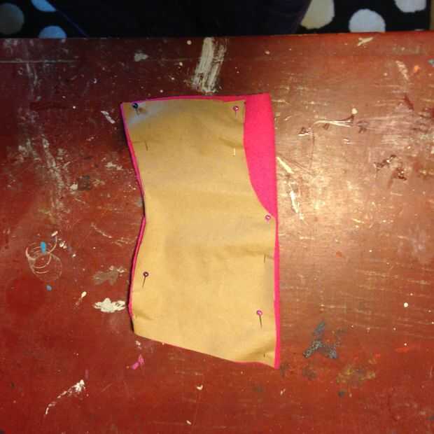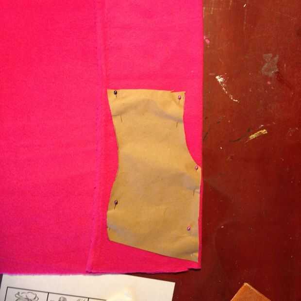 Recorte. Ahora doblar su poco de paño grueso y suave y coloque el patrón sobre el pliegue. Alfileres y recortarlo. No recorte la parte inferior del contorneada del patrón debido a que inicialmente no permiten para mis costuras. Al final no importaba que no eran contorneadas para solo poder hacer esta parte recto como yo lo hice. Hacer lo mismo con su tela.
