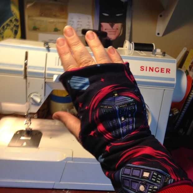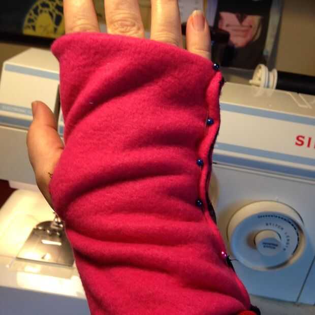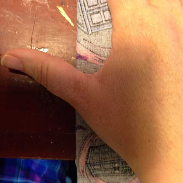 Averiguar donde irá el dedo pulgar. Marcar a cada lado de su dedo pulgar. Añadir aproximadamente 1/4" para que no esté demasiado ajustada. Corte una abertura de cualquier marca.