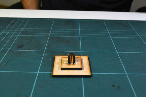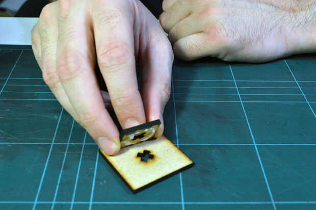 A continuación, encontrar los dos cuadrados pequeños con el corte transversal salidas y nuevo utilizando una pequeña cantidad de pegamento les pegan y luego ajuste el ensamblaje de la luz en la Cruz en forma de ranura. Asegúrese de que la luz pasa a través de ambas capas.