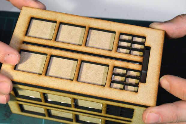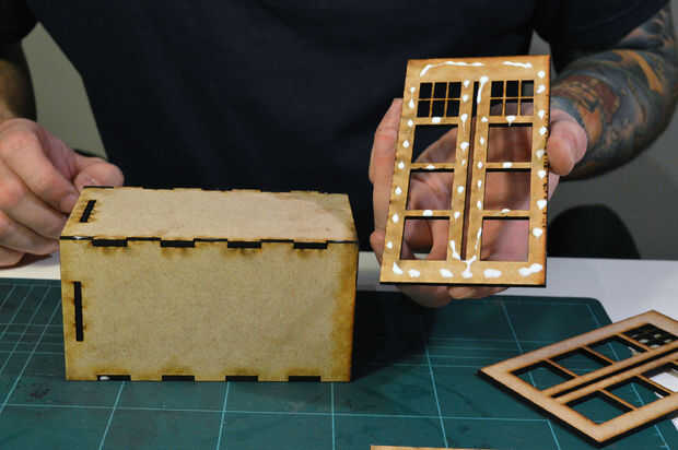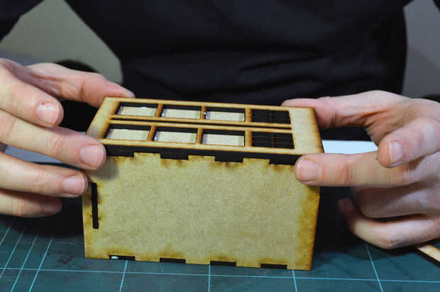 Quite las vendas de elástico, entonces identificar a los más pequeños paneles exteriores y péguelos en primera. Alinee con los bordes de la cubierta interior como se muestra. Debe ser en los lados opuestos uno al otro. Una vez en el lugar, los dos paneles más grandes entonces debe estar alineado con los bordes de los paneles exteriores ya en lugar. Utilizar bandas elásticas para sostener en su lugar. Prestar atención al panel con la ranura del dinero, asegúrese de que alinear esta con el lado de la carcasa interior con la ranura correspondiente.
