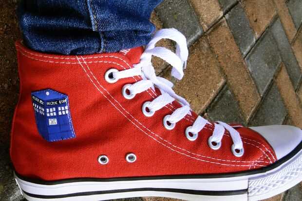 Use pegamento para pegar los Tardises sobre los zapatos y luego coser para asegurar.