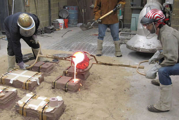Aunque sólo 16 fueron necesarias, 18 ceras entonces fueron fundidas en bronce, utilizando el proceso de fundición de cera perdida. Aquí puedes ver dos de los bronces sin terminar.