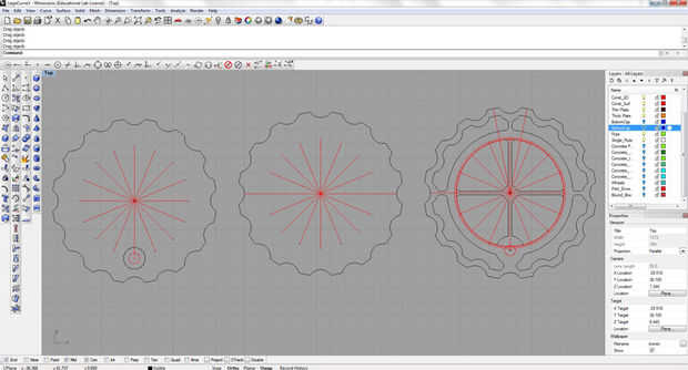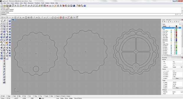 Los diseños de las placas fueron creados en Rhinoceros.  Esto permitiría para alta precisión y para ayuda en conjunto más adelante.  Aquí está una imagen con líneas de construcción de diseño, y otro preparado para el corte.
