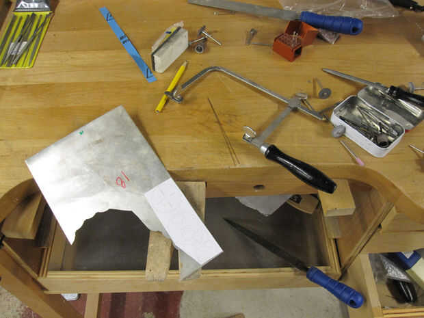 Todas las hojas de metal más pequeños fueron cortados a mano.  Estas son algunas de las plantillas.  Entonces son chorro de tinta impresa sobre el papel y cortar con la mano.