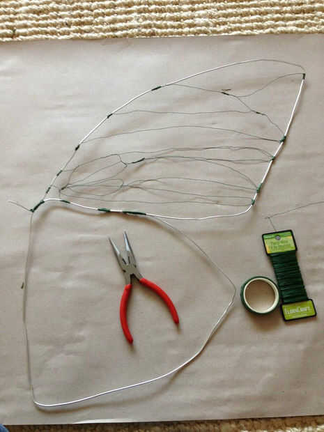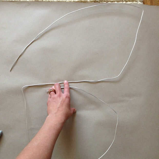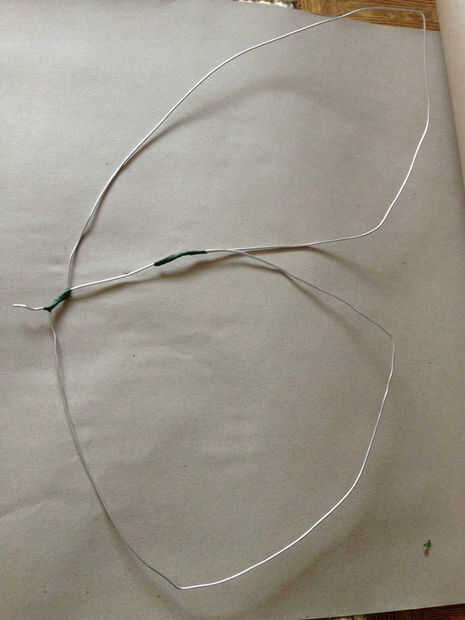 - Con el alambre floral 12 gage*, doble para formar las alas. Asegúrese de que comenzar con 2 pulgadas de alambre extra para cada ala por lo que puede torcer las dos alas juntas. Utilice cinta floral para enlazar el alambre juntos.