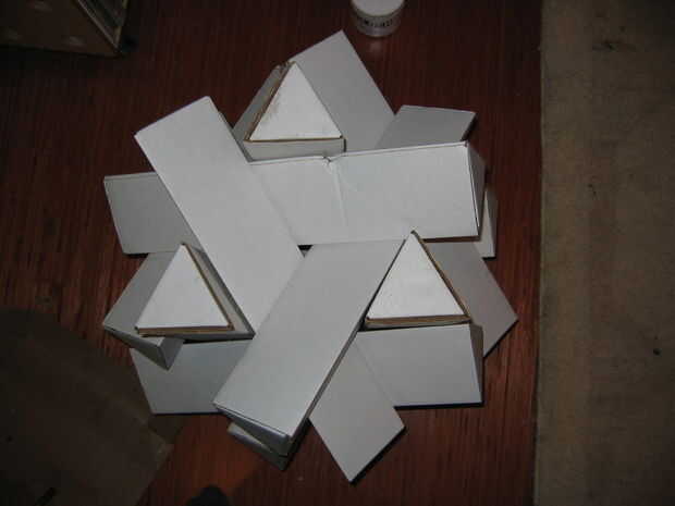 El agujerito que ve entre los tres prismas triangulares de "giros" es un defecto. Las piezas se deben quedar perfectamente ceñidas. Cada prisma es paralelo a un plano de la cara de una forma llamada el dodecaedro rómbico. Una empresa llamada ULINE es proveedor de una de estas casillas de correo electrónico. Usted podría hacer esta forma de prismas ópticos acrílico baratos. Use el cemento acrílico de acción capilar. Esta forma podría servir como la base para una tapa de plástico café o mesa final. (Puedes decidir añadir refuerzo interior a los prismas cartón.)